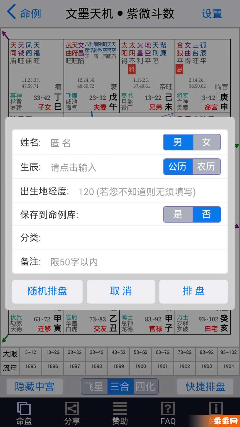 1. 初次使用时,建议在“命例”页面添加新的排盘记录。