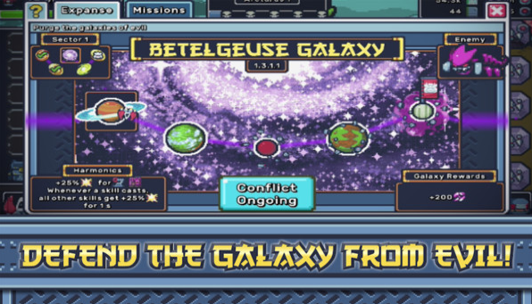 6、通过独特的改变游戏机制发现星系,去特派团收回行星并赚取资源,制作和升级新的闲置技能。