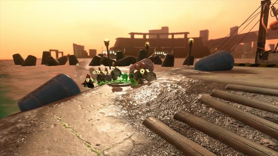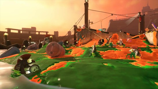 2、Gameinformer的编辑在现场试玩了两局《喷射美少女2》,第一局他使用了新武器“Splat Dualies”,这是一把双持喷枪,射够了以后启动特殊能力用喷气背包腾空,漂浮在战场上方进行输出;在第二局中他使用了他最爱的武器滚筒,感觉与初代无异;