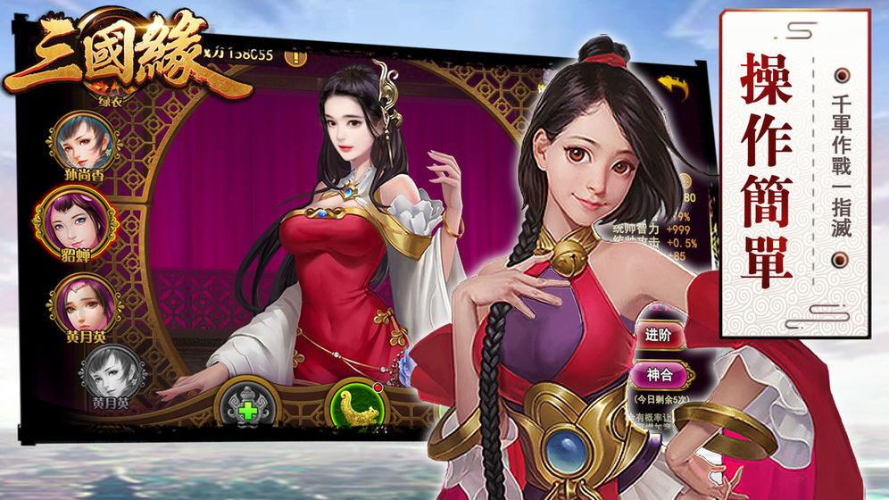 三国缘,妙不可言。以真实三国历史作为背景,收录多个经典战役作为副本关卡,豪华武将阵容,特色武将天命系统,深厚的将帅羁绊助您征战三国。