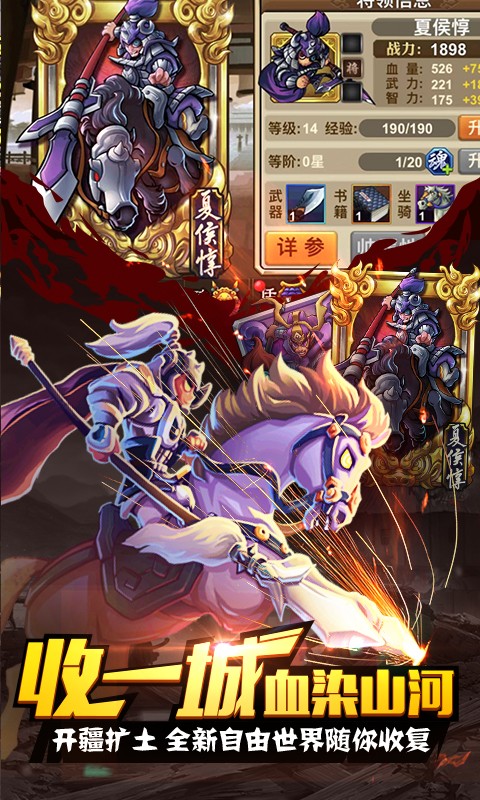 招募武将,运用计策,来征战四方,改变割据的现状,策略排兵布阵的玩法让你享受智慧运营带来的无限成就感,全新的征战系统让你感受沙场酣战带来的无限畅爽!