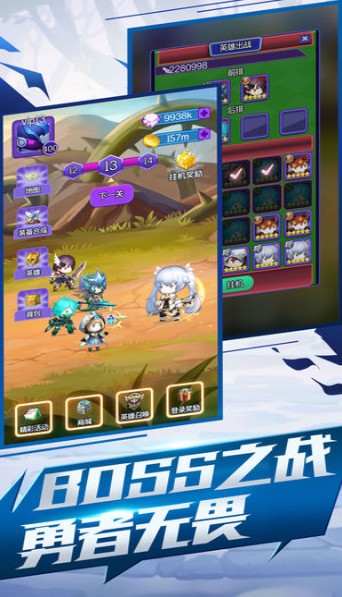 4、丰富的关卡挑战会收获大量的奖励,快来为即将遭遇的强大boss升级你的英雄吧。