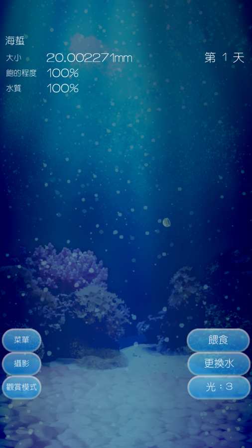 8、本游戏设有通知喂食以及换水时间的功能(可以通过手机的设定更改为有效或无效。只是如果忘记喂食或换水海蜇便会死掉、我们建议您将通知设定为有效)。