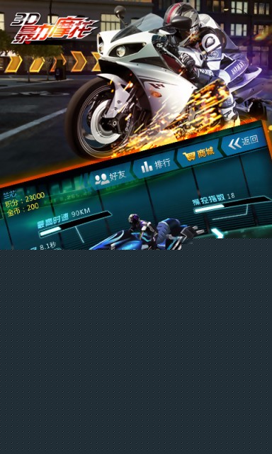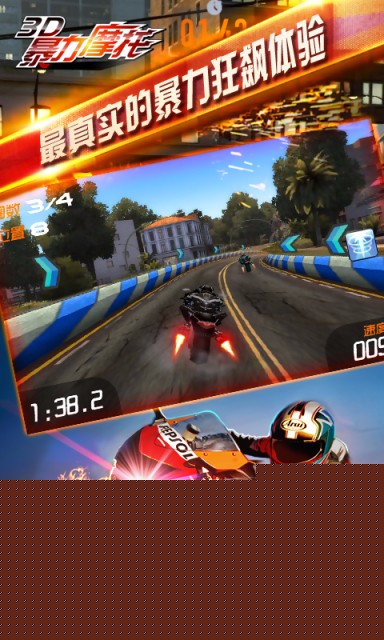 坐在摩托上感受风驰电掣的感觉,现实生活中无法体验就在游戏中感受吧。3D的画面,配合的相当好的音效,玩游戏也有种骑摩托的感觉。