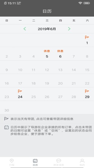 5. 日历功能展示了导游在自由执业企业承接的所有订单,方便导游安排休息和空闲时间。