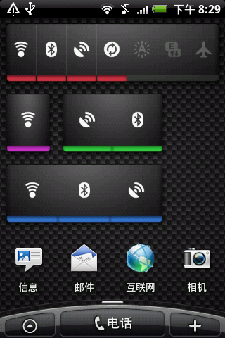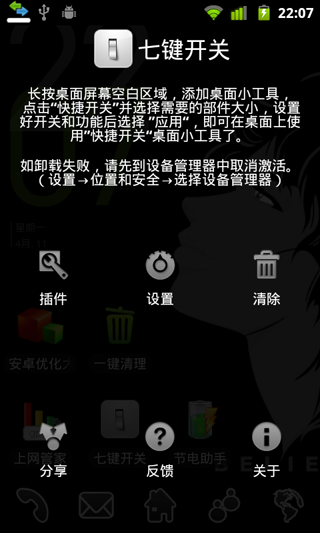1. 七键开关作为主屏幕窗口小部件,提供了wi-fi、gps、蓝牙、移动网络等系统功能的快速启用/禁用操作。