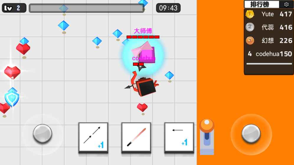1、通过虚拟摇杆控制走位,利用手中的弓箭击败对手;