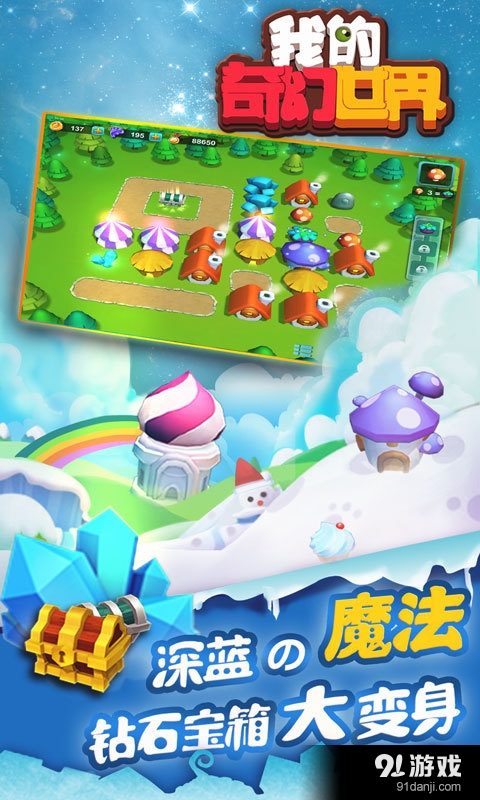 我的奇幻世界是一款充满奇幻色彩的休闲益智类安卓手机游戏,将玩家带入一个美丽又浩瀚的星空中的蔚蓝色星球——莉奥安娜。在这个星球上,阳光轻拂过绵延的雪山、静谧的海蓝和炙热的沙漠,形成了一幅幅动人的画卷。游戏的核心玩法基于物体合成,只要3个以上相同的物体聚集在一起,就能合成出新的物品,比如3颗蘑菇可以合成出灌木,3颗灌木再合成出小树。此外,游戏还包含丰富的关卡和任务,玩家需要在森林、雪山、沙漠和山林等不同场景中建造最高级的神迹,以吸引幸福女神的降临。
