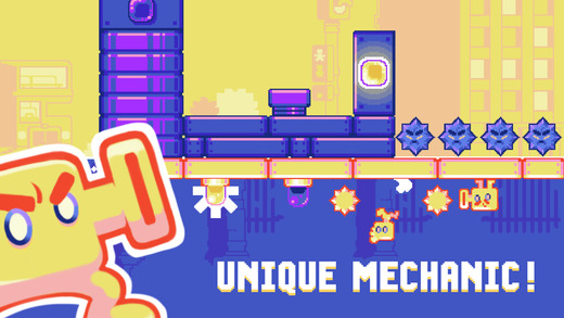 蹦转hopswap是一款充满趣味和挑战的休闲跑酷类手机游戏。游戏采用鲜艳缤纷的像素风格,玩家将在一个复杂度很高但长度无限的横版平台关卡中展开冒险。游戏世界被一分为二,玩家需要操纵主角在两个截然不同的世界(黄色和紫色)之间灵活转换,以此来躲避陷阱和机关,同时收集宝石。由于角色不能手动停止,玩家只能通过划动屏幕改变其移动方向或点击屏幕使其跳跃,操作简便却极具挑战性。
