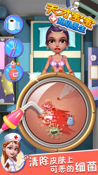 在这个天才宝宝的医院娱乐应用中,你需要扮演最好的医生的角色,运用你所有的单血技能对病人进行有趣的治疗,你的职责是帮助那些可怜的病人从休克和疼痛中恢复过来。还在等什么,成为天才宝宝超级医生吧!为你的病人治疗,让小朋友们认识到保护身体的重要性。
