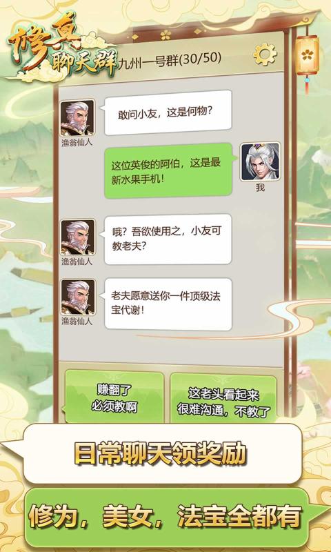 修真聊天群v1.0.0安卓版是一款古风元素的另类主题聊天闯关类休闲娱乐游戏。玩家在游戏中将加入一个修真聊天群,结交各个仙界大佬,并通过与他们的对话和互动,完美通关,最终在大佬的帮助下逆袭成仙。游戏背景设定在修仙题材的世界,玩家可以在这个充满神秘与玄幻的修真世界中,体验到不一样的刺激玩法。