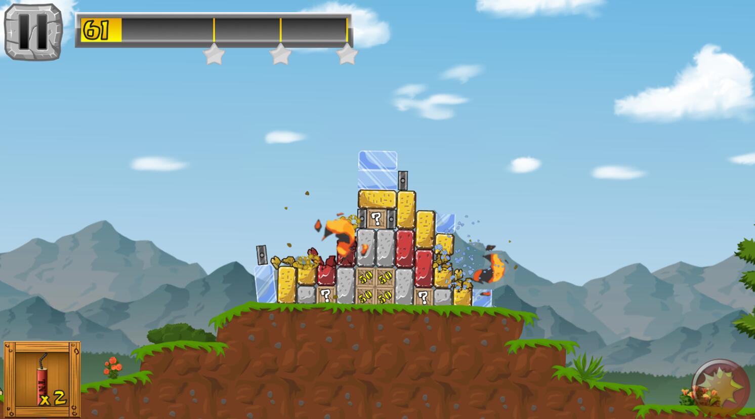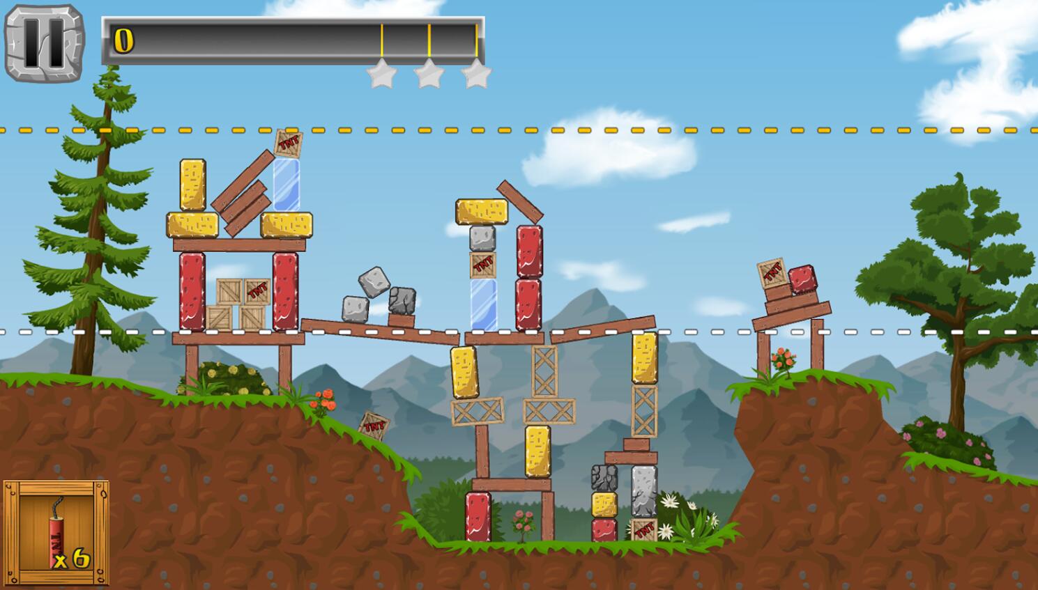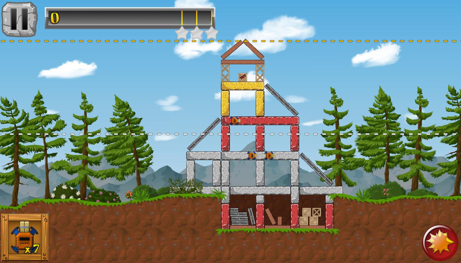 在这个游戏中你会发现不同类型的对象的破坏:不同的阻力,玻璃,木材,包装箱和坚不可摧的钢筋砖。