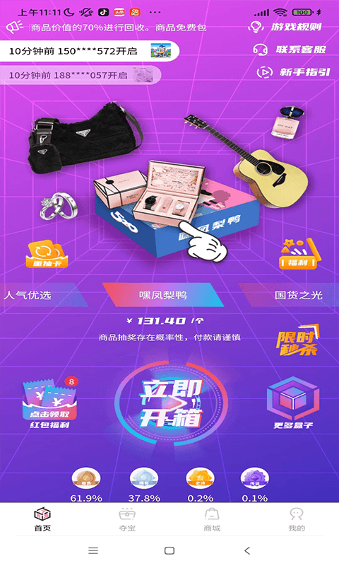 1. 盲盒购物:潮物盒子以盲盒的形式进行购物,增加了购物的趣味性和惊喜感。用户可以随意拆开盲盒,获得不同的奖品和福袋。