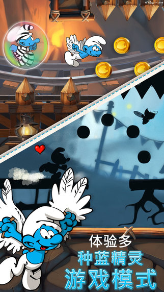 蓝精灵:纵情快跑:在华丽的 2D 图像中体验新一代跑酷游戏!选择你最喜欢的蓝精灵,开始一场史诗的冒险,将其它蓝精灵从格格巫那里解救出来;