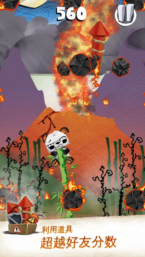 5、在火山爆发时,利用有趣的道具生存更长时间,获得高分超越好友,在排行榜上占据顶尖席位,证明您才是能力最佳的熊猫;