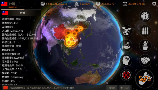 导弹外交是一款非常好玩的国家策略经营游戏,你的目标就是让自己的国家成为地球板块上面最强、最好的国家,在游戏中只要你有足够的实力就可以随意的侵掠其他国家扩大自己的地图版块。