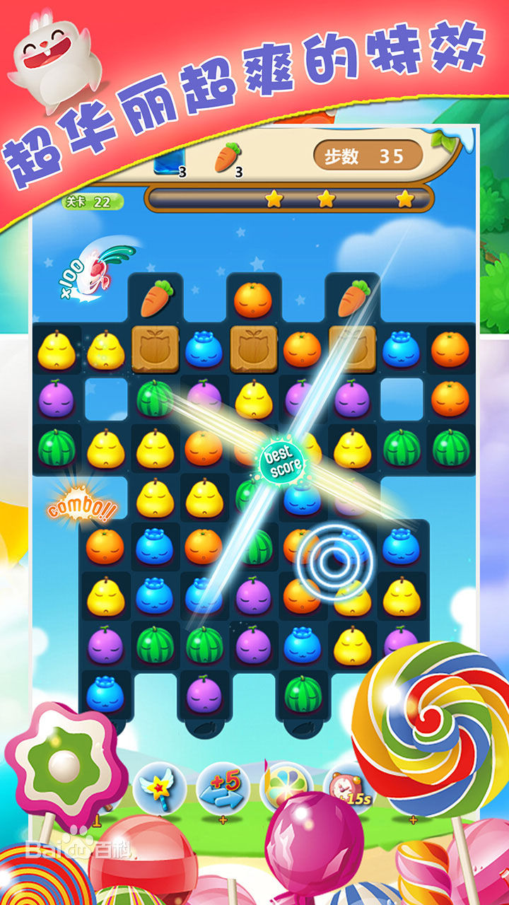 2、【可爱的爆萌画面】史上超萌超可爱的休闲消除游戏!梦幻甜美的水果风格、栩栩如生的Q萌卡通形象、无不体现设计师的智慧与游戏的卓越品质。