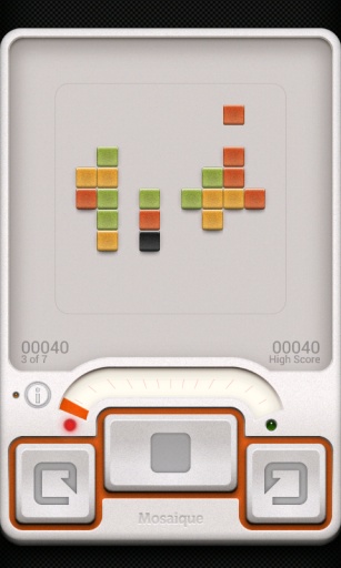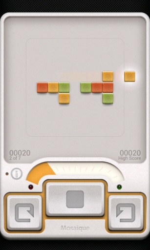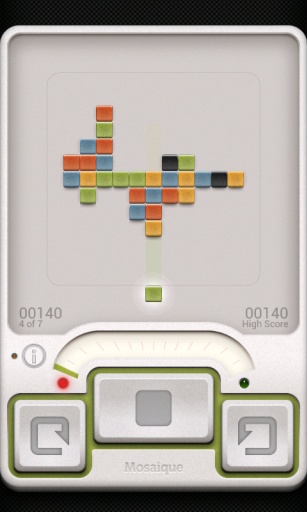 完成一局《Mosaique》大约需要10分钟,这款游戏能够帮助大家打发等人、排队等碎片时间,在短暂的时间体会到乐趣。就像《俄罗斯方块》的整体设计一样。因此,我们可以看到游戏的界面被设计成了硬件的样式,为了把这个想法做到极致,他们甚至连按键声也是在东京秋叶原录制的微型开关的声音。