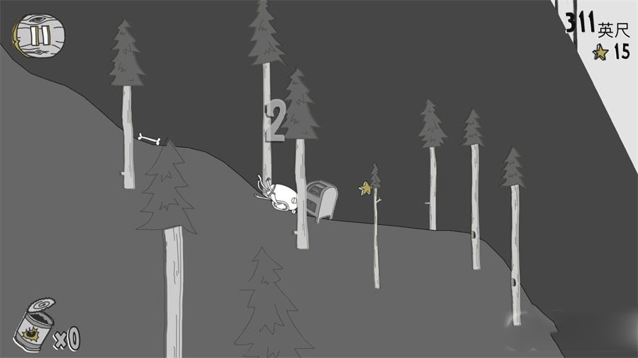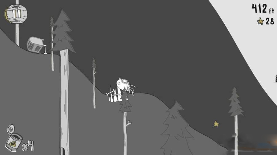 3、骑上破烂的小车撞上树桩就可以滚下山崖收集星星了。