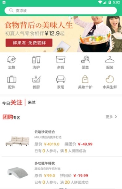 1、首页展示热卖商品,新品以及推荐商品。购物专区拼单购买更加优惠。