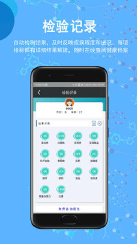 检测中心---随时使用智能手机扫描,进行尿液14项、阴道炎六联检、便潜血、小儿腹泻等项目检测,检验记录自动保存,并可进行趋势分析,随时监 测健康状态。