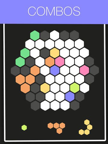 《Hex FRVR》玩起来有点像经典的《俄罗斯方块》。游戏的主界面是以边长为5个六边形组成的大六边形的棋盘,玩家拖动系统自动输出的各种六边形组合置空白处,使之排列成完整的一行或多行并且消除得分,连续消除会有额外Combo加分。直到棋盘上再也无法摆下任意一个六边形组合的时候,游戏就会失败。
