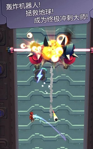 2. 单指操作与策略深度:仅需点击屏幕实现斜向跳跃、上滑触发冲刺护盾、自动发射跟踪导弹三大核心操作,但需精准控制能量消耗与攻击时机。例如在BOSS战中,需优先躲避激光扫射,利用冲刺护盾抵挡导弹,再寻找间隙发射导弹反击。