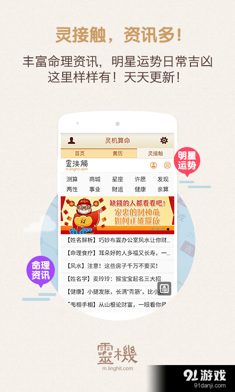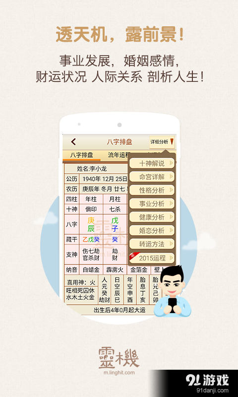 灵机算命八字星座解梦风水是一款功能全面、深度解析人生各方面的手机应用。这款软件融合了传统的八字、紫微、易学、相学等命理知识,以及西方的占星术和性格测试,旨在为用户提供全方位、多层次的命运预测与人生指导。通过这款软件,用户可以轻松了解自己的生辰八字、每日运势、事业爱情情况等,从而更好地规划自己的生活。