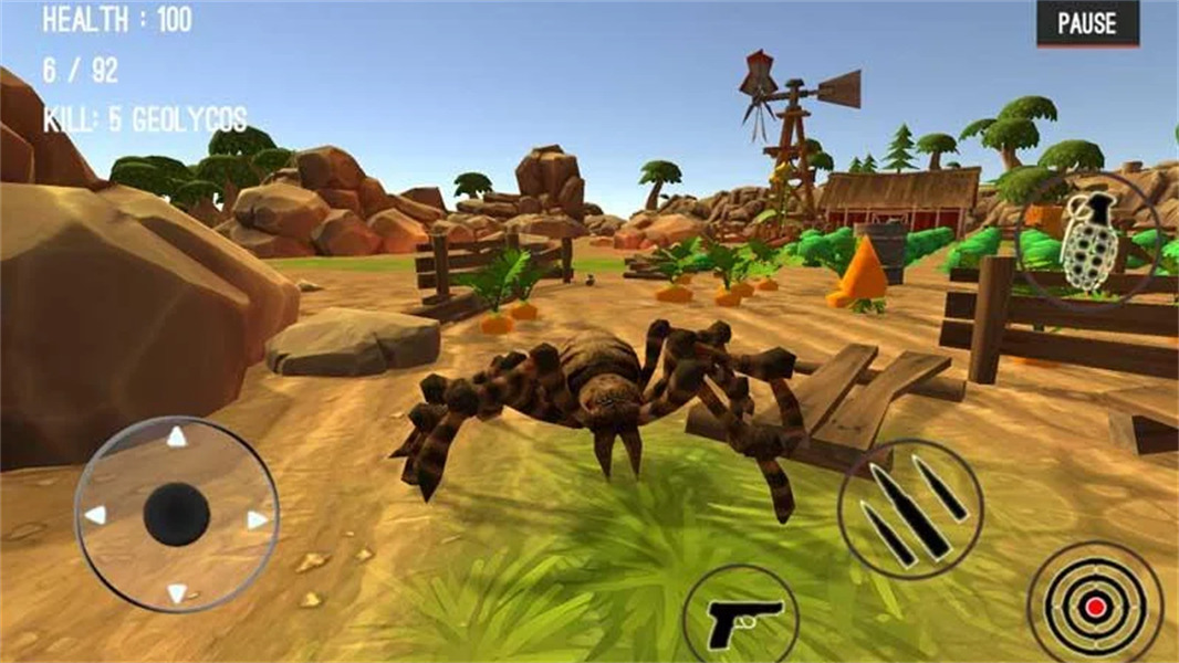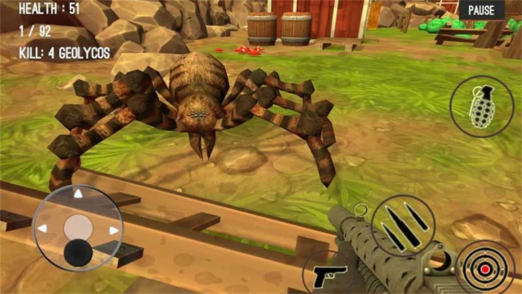 1. 第一人称沉浸体验:游戏采用虚幻引擎4打造,蜘蛛的复眼结构、肢体关节运动与毒液喷射特效均达到写实级水准。玩家可清晰看到蜘蛛口器开合的细节,以及子弹击中蜘蛛外壳时迸溅的绿色体液。