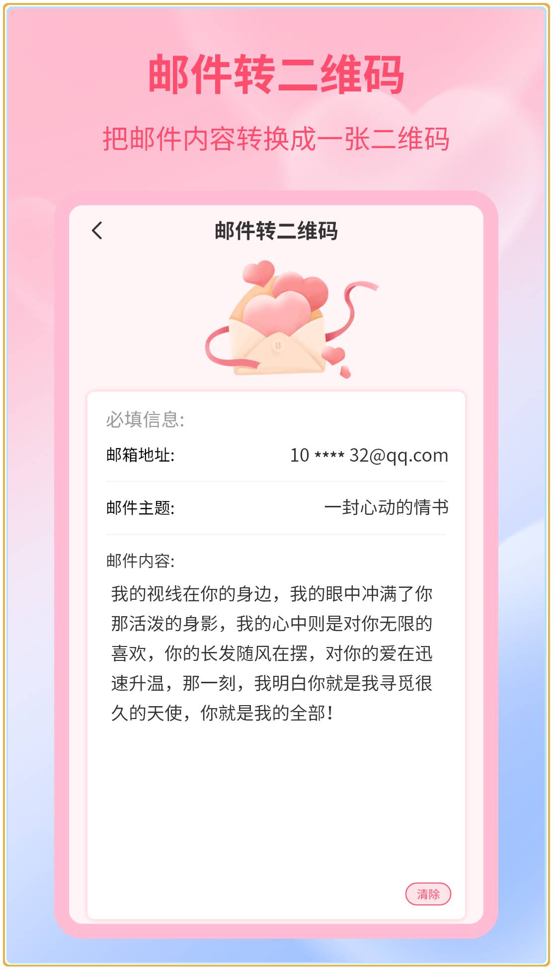 情书二维码:用户可以自定义情书内容,生成专属二维码,收件人扫描后即可查看,为爱情或友情增添一份特别的仪式感。2.