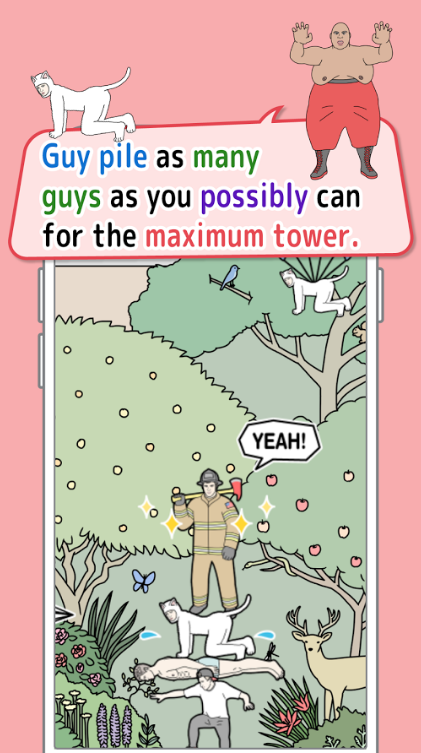 1. 堆叠挑战:玩家需将不断从右上角降落的男性角色精准地放置在塔顶,保持塔身的稳定。