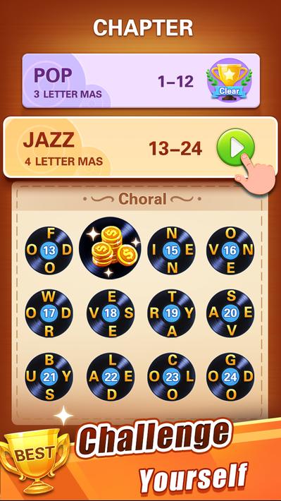 文字游戏音乐:拼字游戏是一款结合了音乐节奏与智力挑战的创意安卓休闲游戏。在这个独特的游戏中,玩家不仅要享受由专业作曲家精心打造的动感旋律,还需通过快速拼凑出屏幕上显示的英文单词来与音乐节奏同步。游戏巧妙地将音乐的律动与文字游戏的乐趣融为一体,让玩家在挑战智力的同时,也能沉浸在美妙的音乐海洋中,体验前所未有的游戏快感。