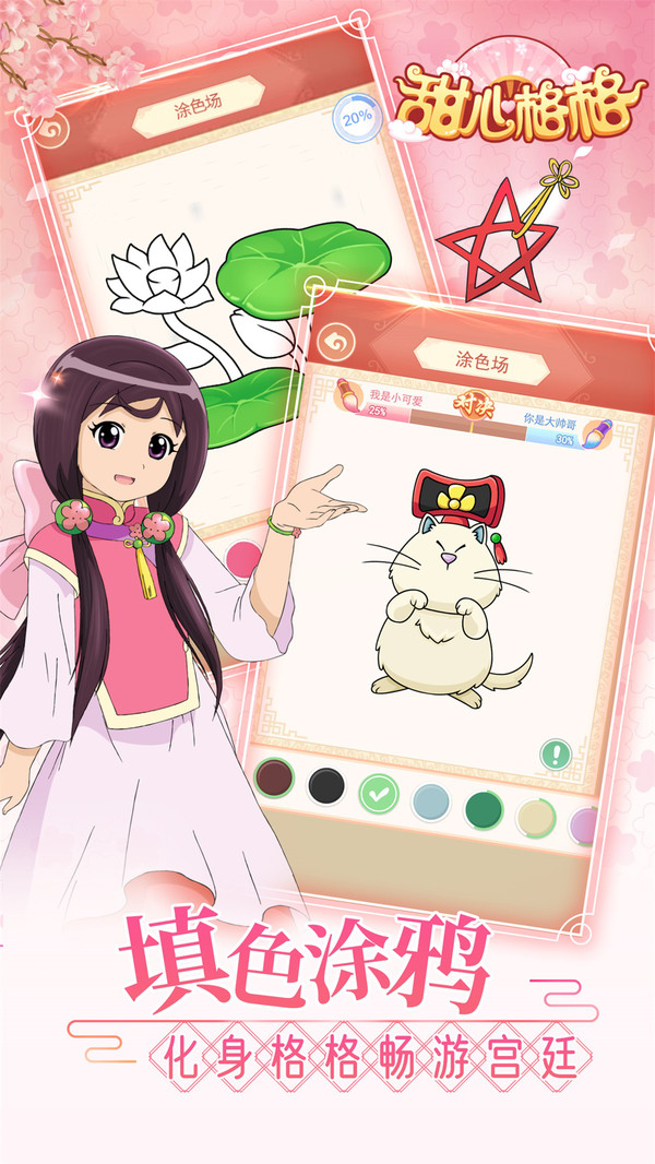 甜心格格涂色画家是一款集合了古风换装与涂色玩法的休闲益智类安卓游戏。玩家在游戏中将扮演一位格格,穿越至古代宫廷,体验丰富多彩的宫廷生活。通过闯关、涂色、换装等多种玩法,享受宫廷冒险的乐趣。游戏画面精美,角色设计生动,故事情节引人入胜,是一款适合放松娱乐的游戏。