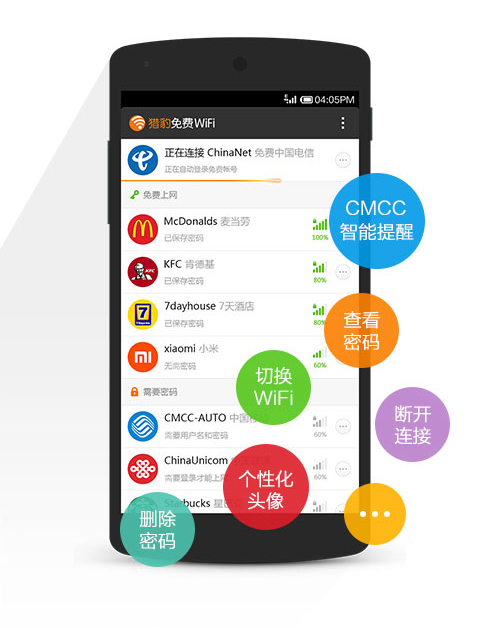 猎豹wifi是一款功能强大的安卓wifi管理软件,它能帮助用户轻松管理手机连接的wifi网络,提供安全、稳定的网络体验。通过猎豹wifi,用户可以一键连接附近的wifi网络,并实时查看网络状态,享受便捷的上网服务。