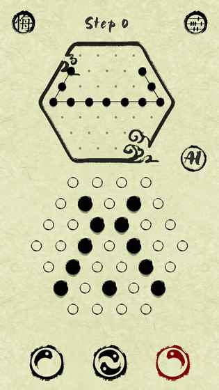 游戏中,墨点与墨圈拼成六边形阵列,点击一个非边缘点,同一六边形顶点的墨点与墨圈联动。有三种联动方式:顺时针一格、逆时针一格、对角互换。经过变换,拼成目标图案即可通关。