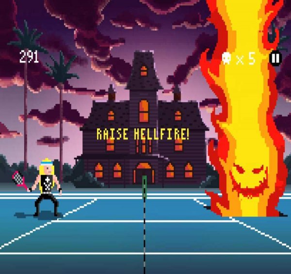 当摇滚重金属与休闲的网球相遇时,会摩擦出怎样的火花呢?主角是一个满头金发,一身金属朋克风造型的男子,手持着一把电吉他一把网球拍,站在网球场上。在球场的另一端站立的不是人类,而是路边常见的垃圾箱等设施,与玩家们练习网球的正是这些奇异的物体。玩家连续得分,还可能激怒出恐怖的“地狱魔王”,那就是用生命在打网球了!不止是画面非常重金属,游戏的背景音乐也让玩家们无时不刻感受到它的热情。