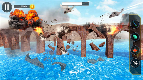 1. 核心玩法:玩家通过拖动地图选择破坏区域,点击右侧武器栏发射导弹或释放技能,破坏建筑可获得金币与经验值,用于解锁新地图(如“未来科技城”“沙漠遗迹”)与武器(如“巨型机械章鱼”“地震模拟器”)。