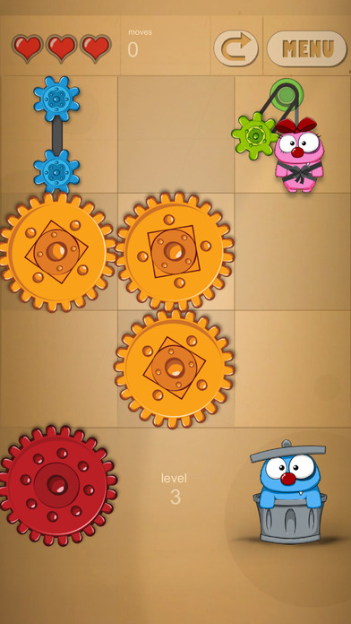 齿轮在一起操作很简单,没有过多复杂的设计,只是一些简单那的齿轮,需要准确的控制好齿轮的的转动的速度,以及齿轮上的绳索来运输,当然也是要注意周围的齿轮的位置,不要让齿轮将绳索切断,只要在要到最终的位置时,才可以弄断绳子的。游戏中设定看50多个关卡,每一个关卡的难度都是不一样的,越到后面,挑战性就越大,更需要你的策略来慢慢的到达终点,为了他们的爱情努力吧。