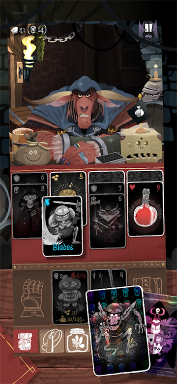 2. 丰富卡牌与装备系统:卡牌类型涵盖攻击(剑卡)、防御(盾牌卡)、恢复(药水卡)、得分(金币卡)等,装备系统提供基础属性加成与独特被动效果(如“月光护符”夜间提升暴击率、“荆棘甲胄”反弹伤害),玩家可通过收集符文石、宝石、魔法披风等道具强化角色。