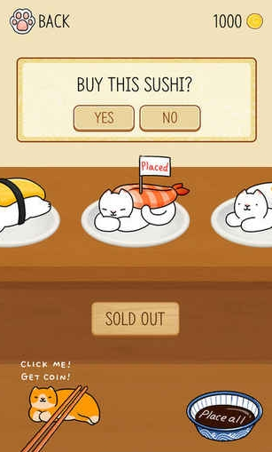 1、屏幕上方是回转寿司带,会有不同的猫咪以及寿司飘过,点击屏幕让寿司或猫咪落下到桌上;