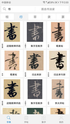 2. 内容分类:软件内容分类详尽,包括篆、隶、楷、行、草等多种字体,以及按朝代、作者、字帖内容等多种检索方式,方便用户精准定位。