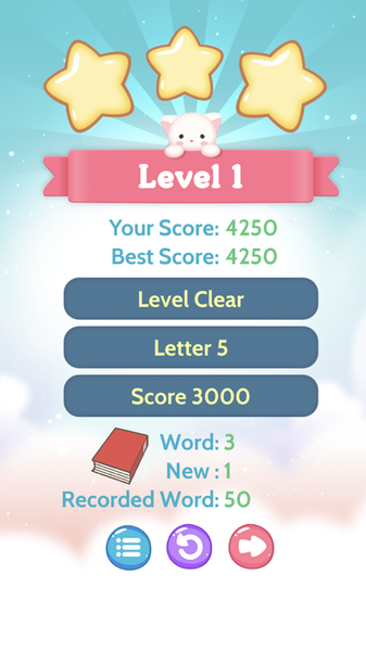 猫咪掉到底端即算通关,根据消除单词的数量,给予星级评价;
