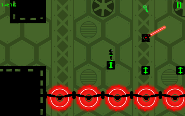 据悉本作一共为我们带来了60个游戏关卡,5个可以选择的独特角色。玩家将在遍布着激光、电锯以及尖刺等陷阱的场景中冒险前行。游戏分别以红色和绿色来表示危险与安全区域,而玩家要做的就是要确保小人远离带有红色亮光的物体或区域,与绿色相伴,在保持节奏的前提下与一路狂奔。
