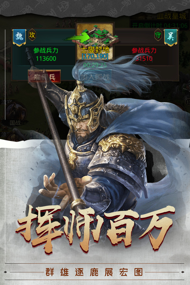 浴战三国是一款三国题材的策略战争类手游,高度还原了众多三国历史战役,三国名将都将悉数登场,给你带来全新的三国体验。自由招募各种武将,不同的武将拥有不同的技能,策略搭配参与各种活动。多款兵种自由养成,组建自己的强大军队,军事农业一起抓,没有充足的粮草都无法战斗的。策略运用各种战术,击败各国诸侯,扩充自己的领土,成为自己的传奇,建造自己的帝国时代。