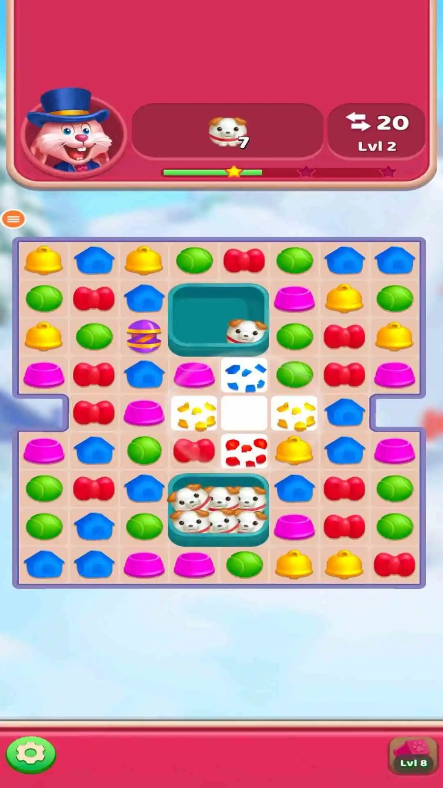 2. 目标导向玩法:每关设有明确目标,如“消除20个红色方块”或“帮助5只狗狗回到家园”。新手需优先完成目标,避免过度追求高分导致步数耗尽。