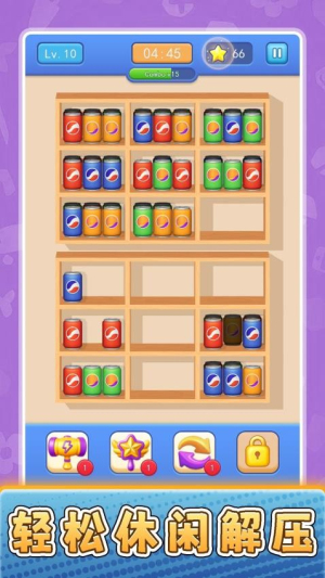 2. 关卡挑战设计:游戏采用动态关卡结构,货架布局随关卡变化呈现不同形状与分区(如L型、十字型等),玩家需针对每种结构制定专属整理方案,部分关卡引入被锁货柜、障碍物或特殊组合货柜,需通过特定操作(如使用道具或触发连锁反应)才能解锁消除。
