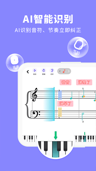 1. AI实时纠错与智能评分:采用行业领先的高精度音频比较算法,秒级识别弹奏中的音高偏差、节奏错误及指法问题,并生成多维度评分报告,涵盖准确性、流畅性、速度稳定性等指标,帮助用户精准定位薄弱环节。