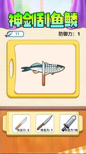 2. 刀具选择:每条鱼显示防御力数值,玩家需根据鱼类防御力选择攻击力匹配的刀具。例如,面对高防御的深海巨兽,需选用攻击力较高的斧头或菜刀;普通鱼类则可使用基础刀具。选错刀具将扣除生命值,初始生命值为3次,失败后需重新挑战。