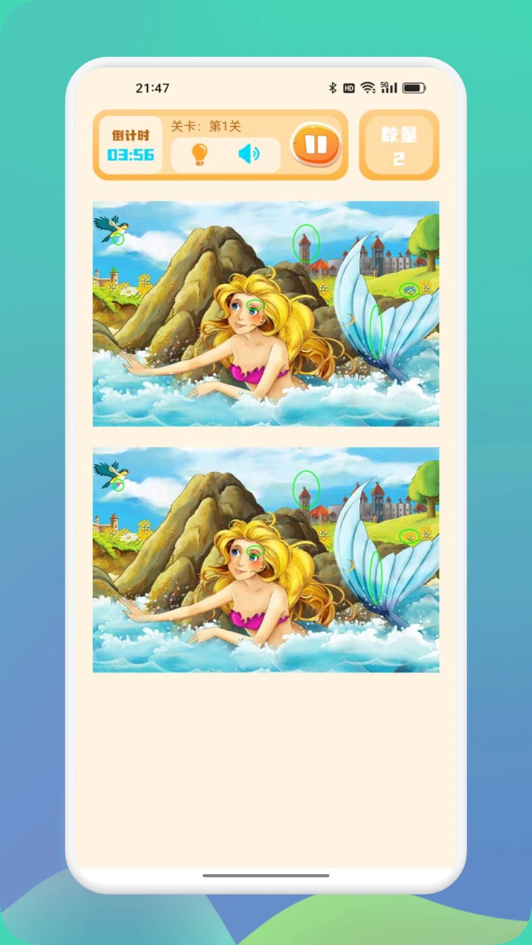 1. 基础操作训练:新手首日需完成“新手引导关卡”,该关卡会强制玩家使用“点击标记差异”功能,并限制每关差异点数量为3个。建议在此阶段重点训练“双手协同操作”——左手滑动屏幕切换视角,右手点击标记,熟练后可将单关通关时间压缩至15秒内。