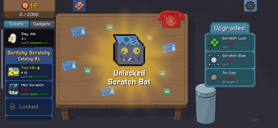 刮个爽模拟器精简版是一款移植自Steam平台的益智休闲类安卓游戏,以虚拟刮奖为核心玩法,融合放置增量与策略养成元素。玩家通过擦盘子积累初始资金,购买并刮开十余种主题刮刮卡赢取游戏币,逐步解锁自动化刮奖机器人、转生系统及永久属性强化。游戏以像素卡通画风呈现复古氛围,真实模拟刮奖触感与清脆音效,搭配炫目光效营造沉浸式体验。其精简版在保留核心玩法的同时优化了操作流畅度与资源占用,支持离线挂机收益,完美适配通勤、摸鱼等碎片化场景,成为解压与策略博弈的双重选择。